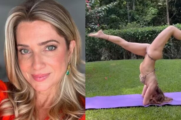 Com biquíni minúsculo, Leticia Spiller exibe elasticidade em treino de ioga
