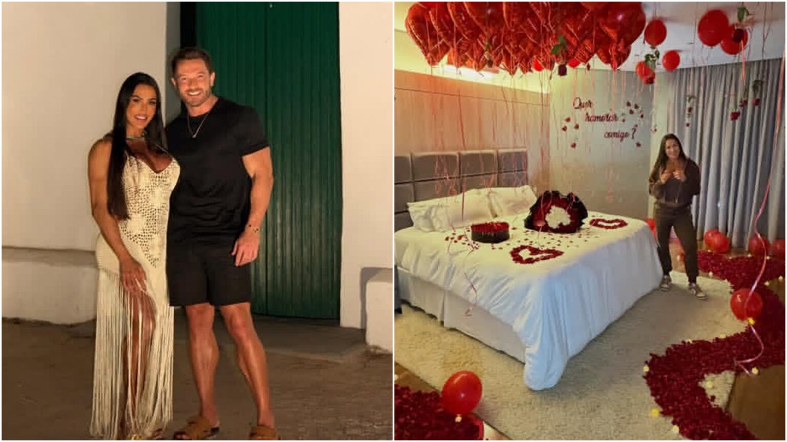 Gracyanne Barbosa assumiu o namoro com Gabriel Cardoso após ser surpreendida com um pedido especial no último domingo (25). O empresário organizou um cenário romântico, com flores, pétalas e velas dispostas em um quarto, onde fez a proposta à ex-BBB. O momento foi compartilhado pela influenciadora nas redes sociais, acompanhando os cliques da surpresa com a legenda: “Obviamente, disse sim”.