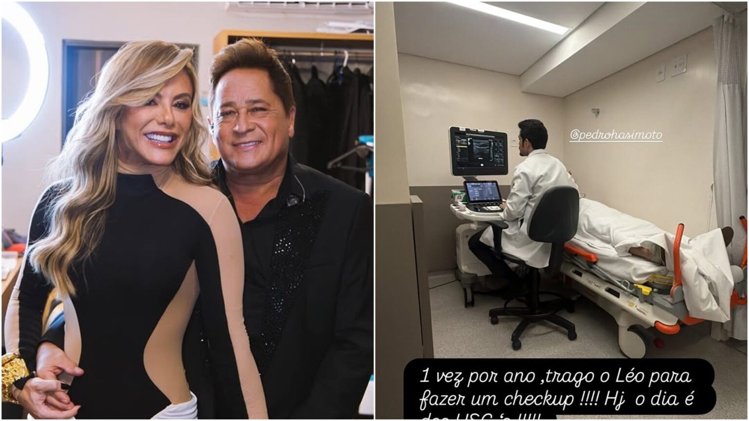 Em suas postagens, a esposa do cantor compartilhou fotos ao lado do marido no carro e, em seguida, o cantor deitado em uma maca enquanto realizava exames de imagem. “Uma vez por ano trago o Léo para um check-up! Hoje é dia dos USGs”, comentou ela ao postar as imagens.